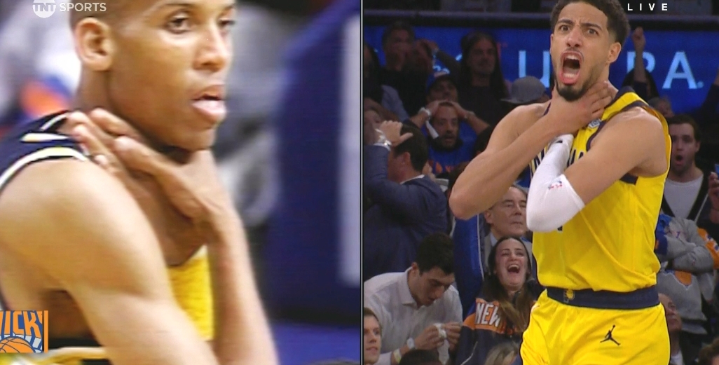 金年会金字招牌信誉至上第四节最后时刻步行者落后两分,哈利伯顿撤步投三分嗑筐后神奇掉进篮筐,以为压哨绝杀的他非常兴奋,做出雷吉-米勒经典的扼喉庆祝动作,不过裁判回放确定踩到了三分线,绝杀变成了绝平。